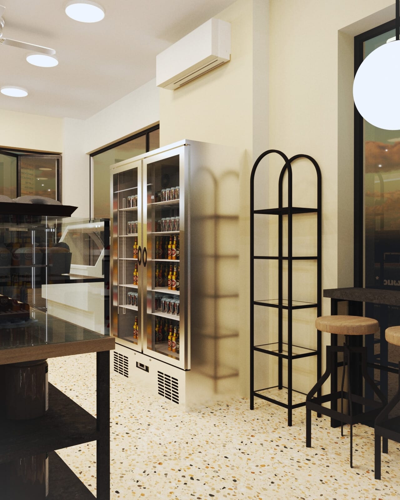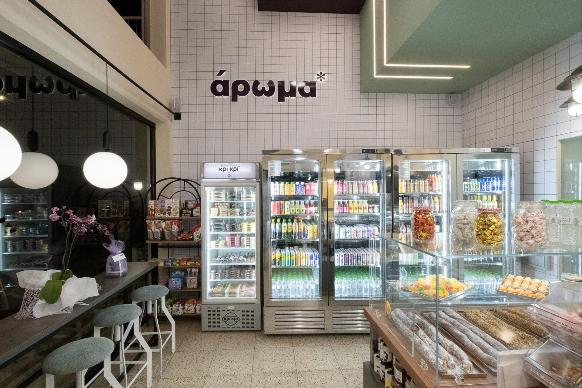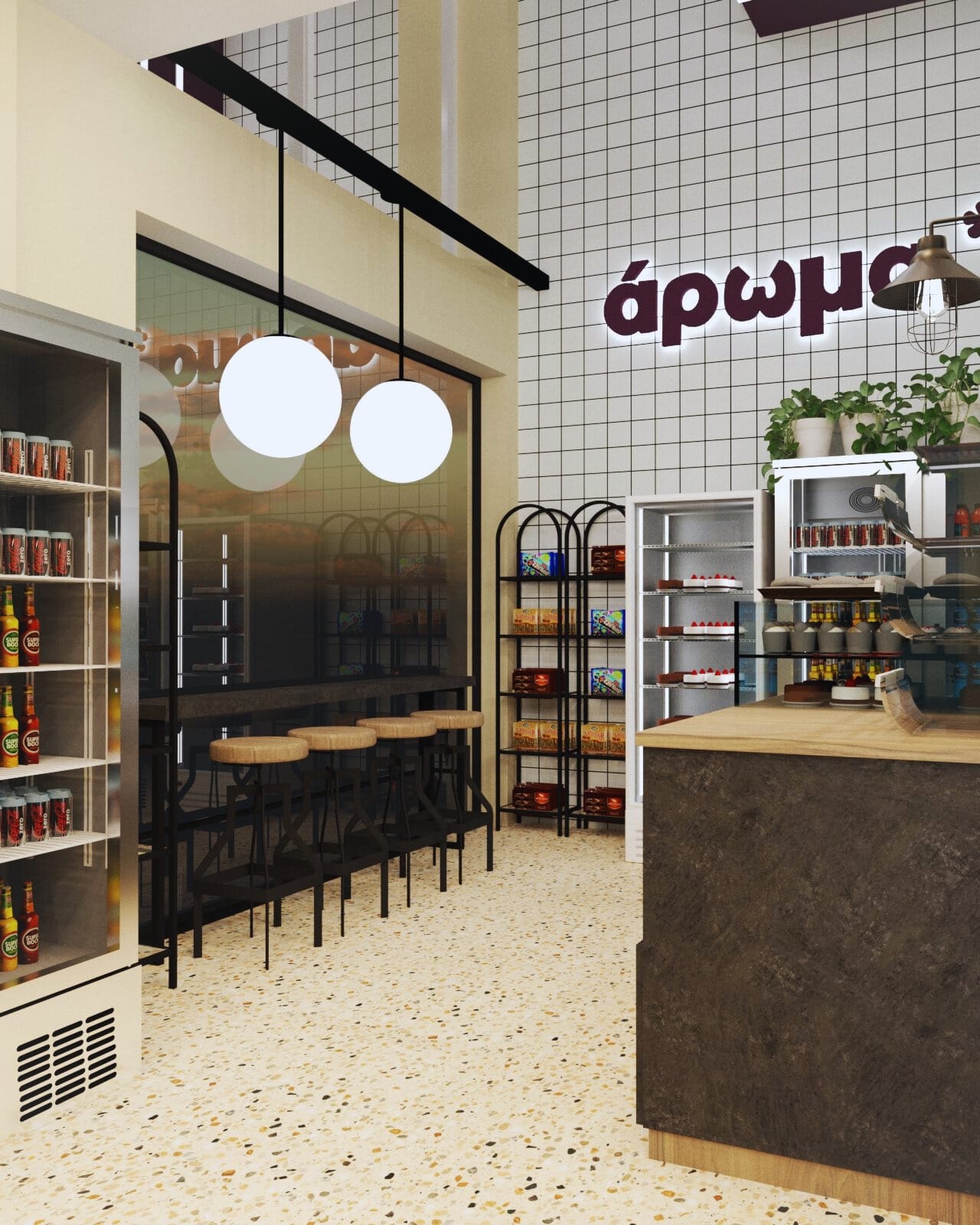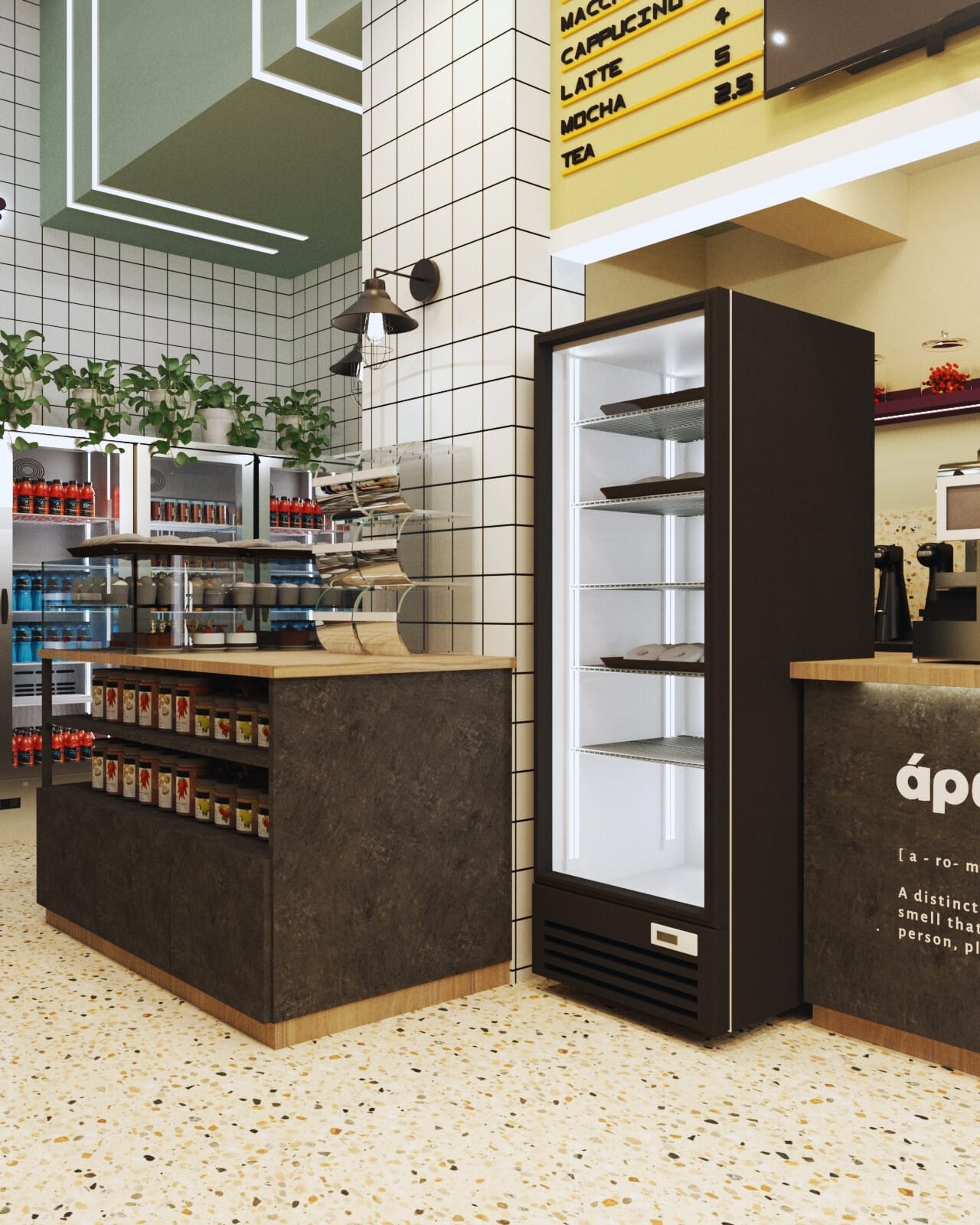 Η επιλογή του δαπέδου terrazzo συνεισφέρει σε μια ρετρό αίσθηση, που παραπέμπει σε κλασικά καφέ παλαιότερων δεκαετιών, ενώ η σύγχρονη εκδοχή του ανανεώνει τον διάλογο με το σήμερα. Η εμφάνιση των ψυγείων και των ραφιών, ενταγμένων στον τοίχο, σχεδιάστηκε έτσι ώστε να διατηρείται οπτική διαφάνεια και λειτουργική καθαρότητα, προβάλλοντας τα προϊόντα σαν εκθέματα.