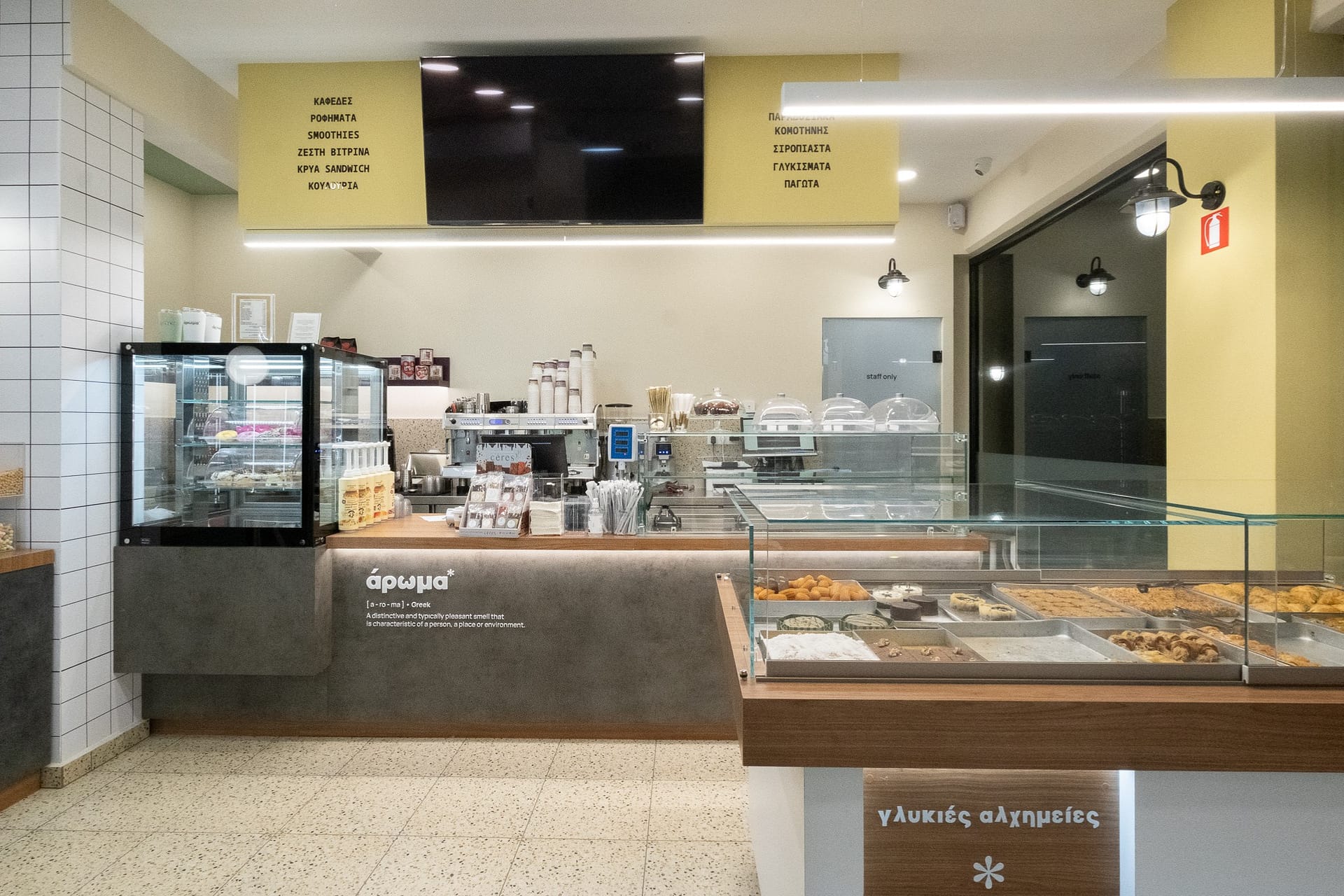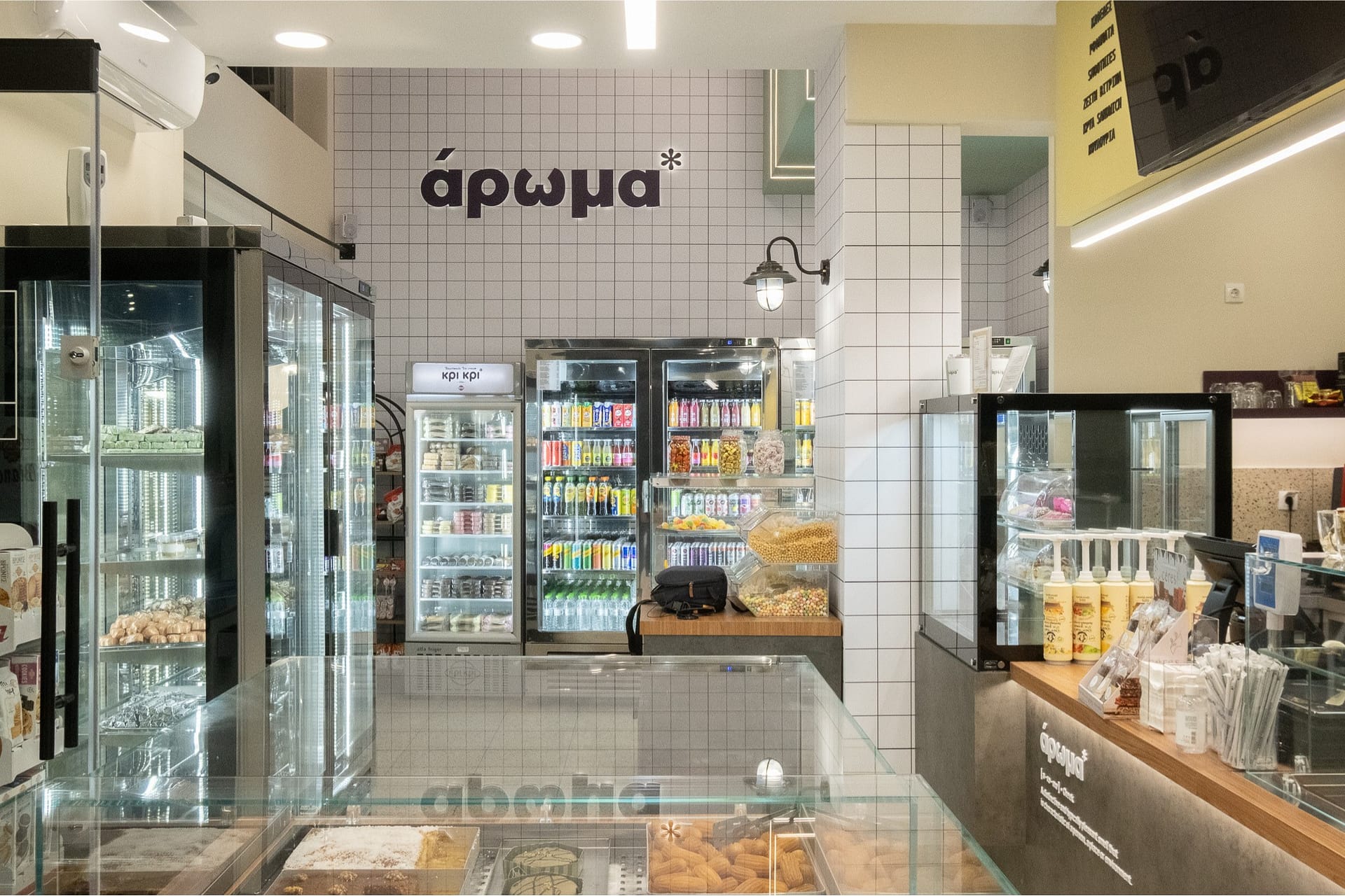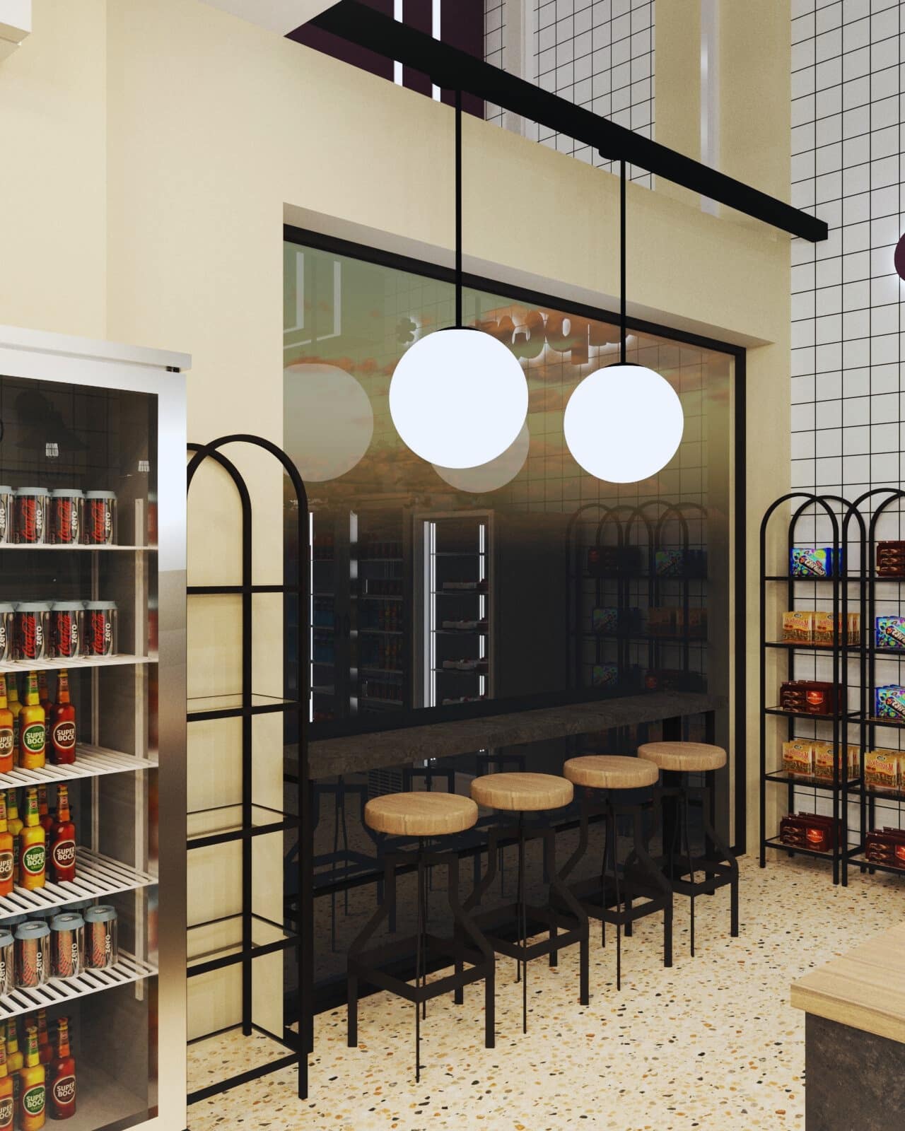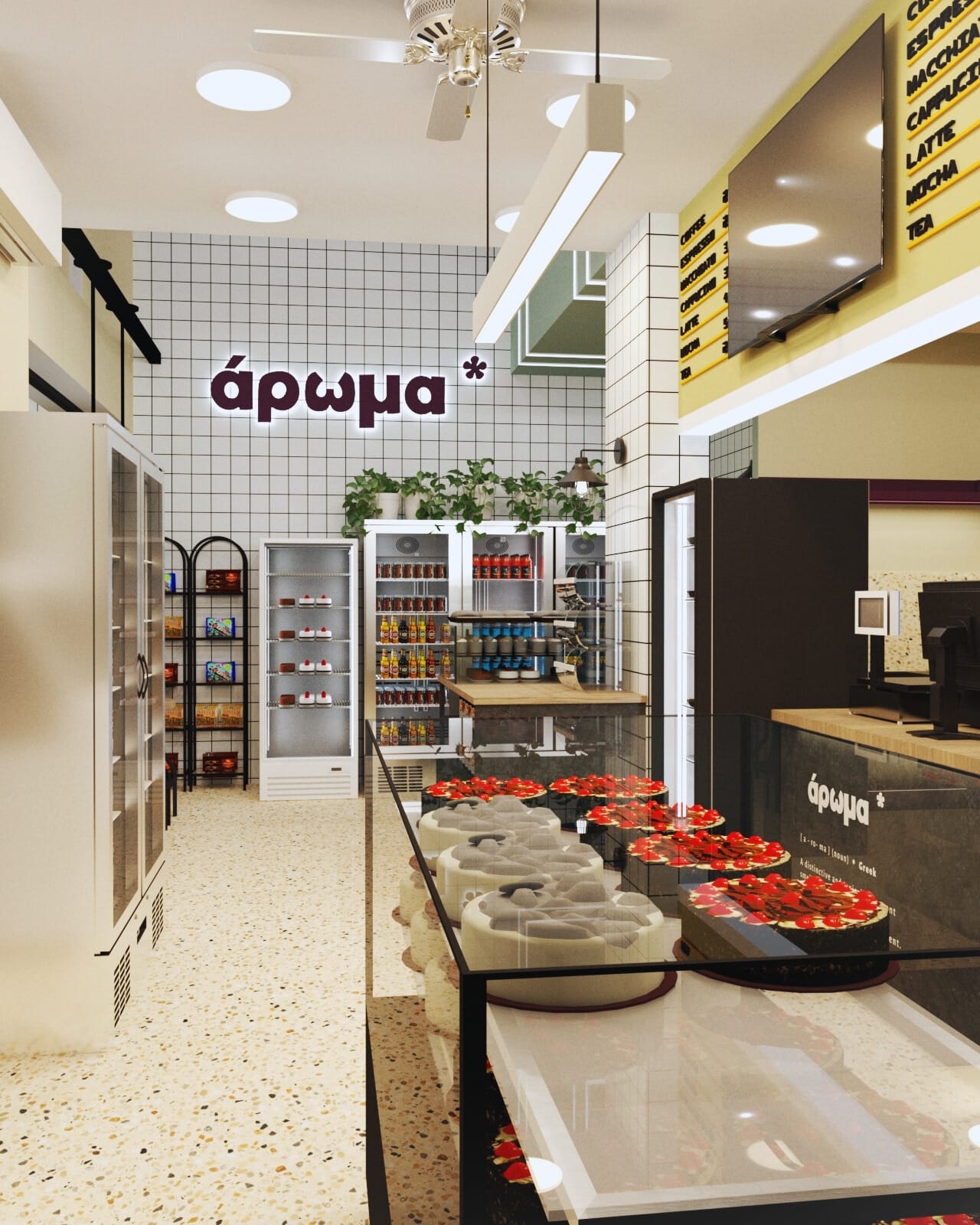 Η επιλογή του δαπέδου terrazzo συνεισφέρει σε μια ρετρό αίσθηση, που παραπέμπει σε κλασικά καφέ παλαιότερων δεκαετιών, ενώ η σύγχρονη εκδοχή του ανανεώνει τον διάλογο με το σήμερα. Η εμφάνιση των ψυγείων και των ραφιών, ενταγμένων στον τοίχο, σχεδιάστηκε έτσι ώστε να διατηρείται οπτική διαφάνεια και λειτουργική καθαρότητα, προβάλλοντας τα προϊόντα σαν εκθέματα.