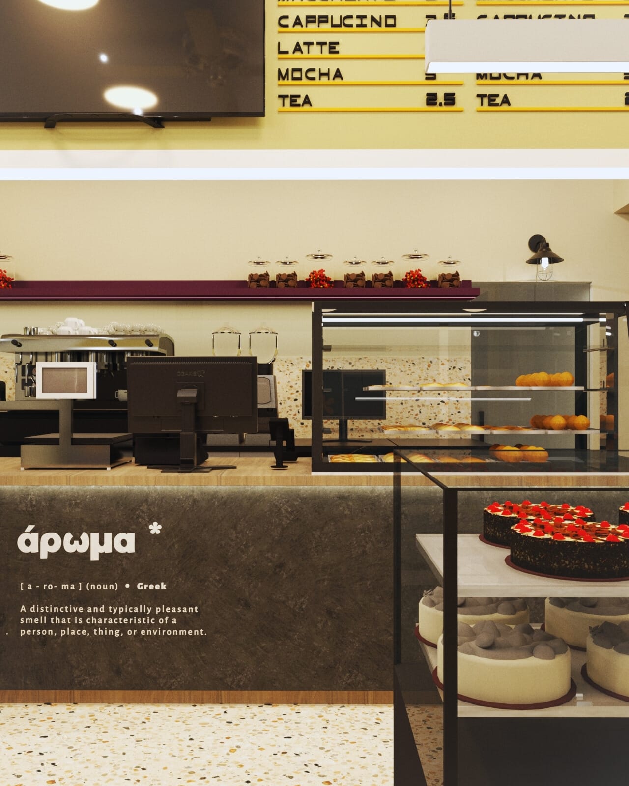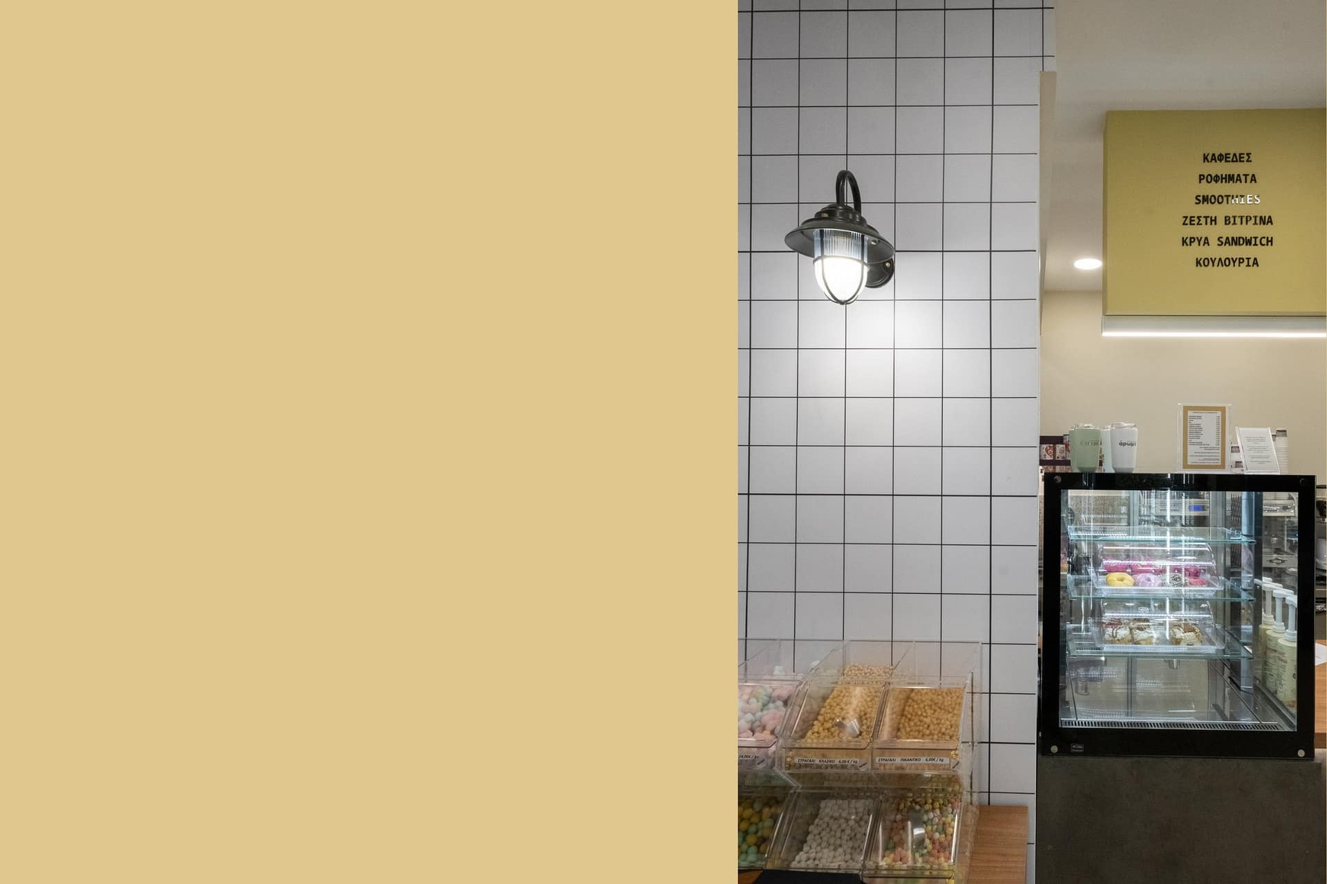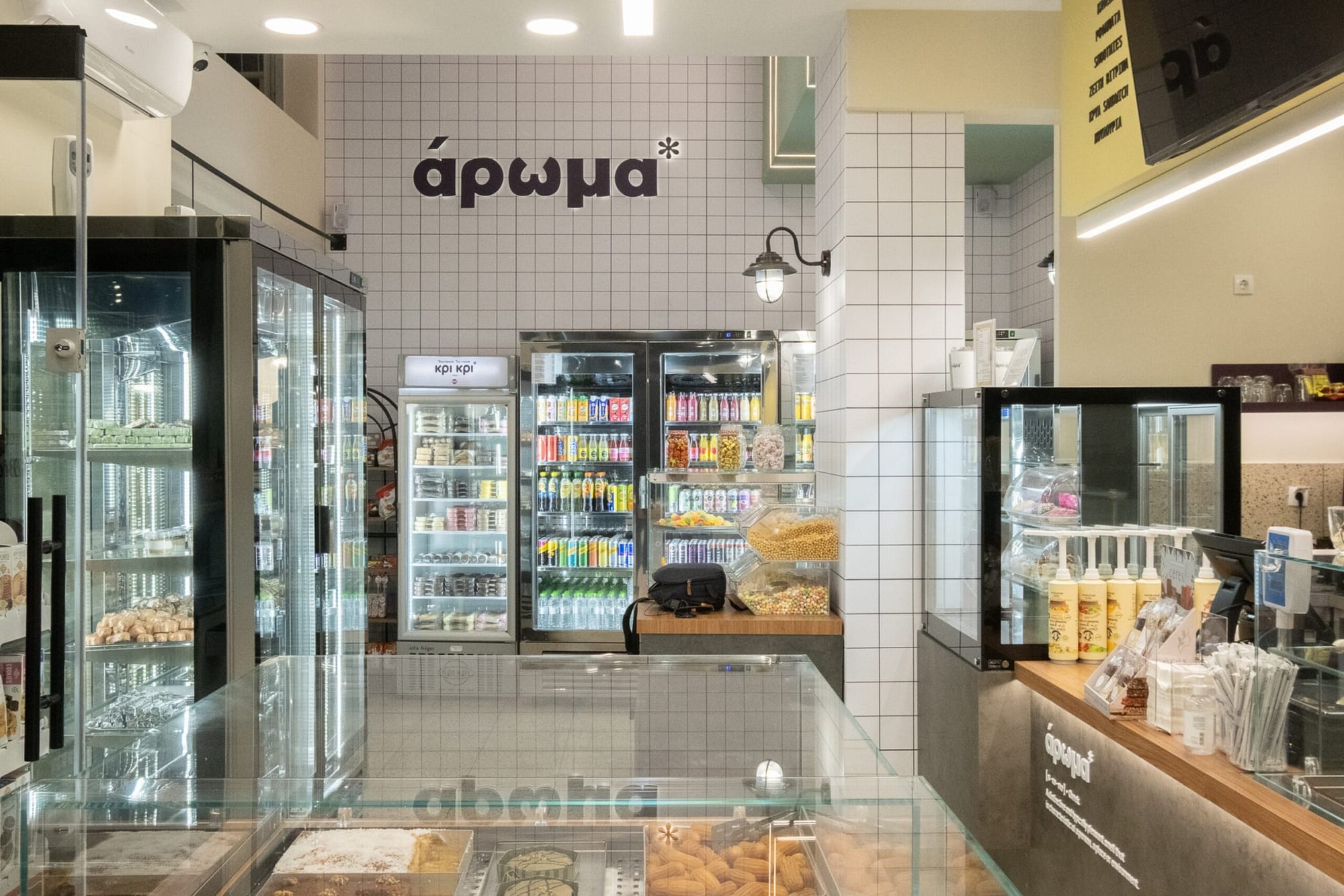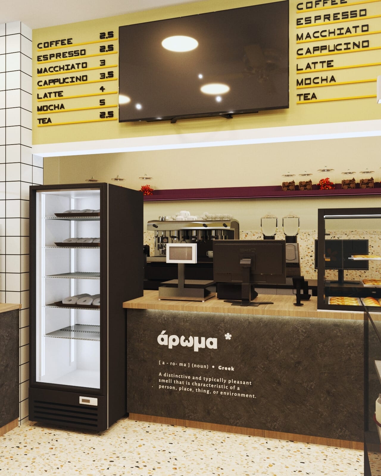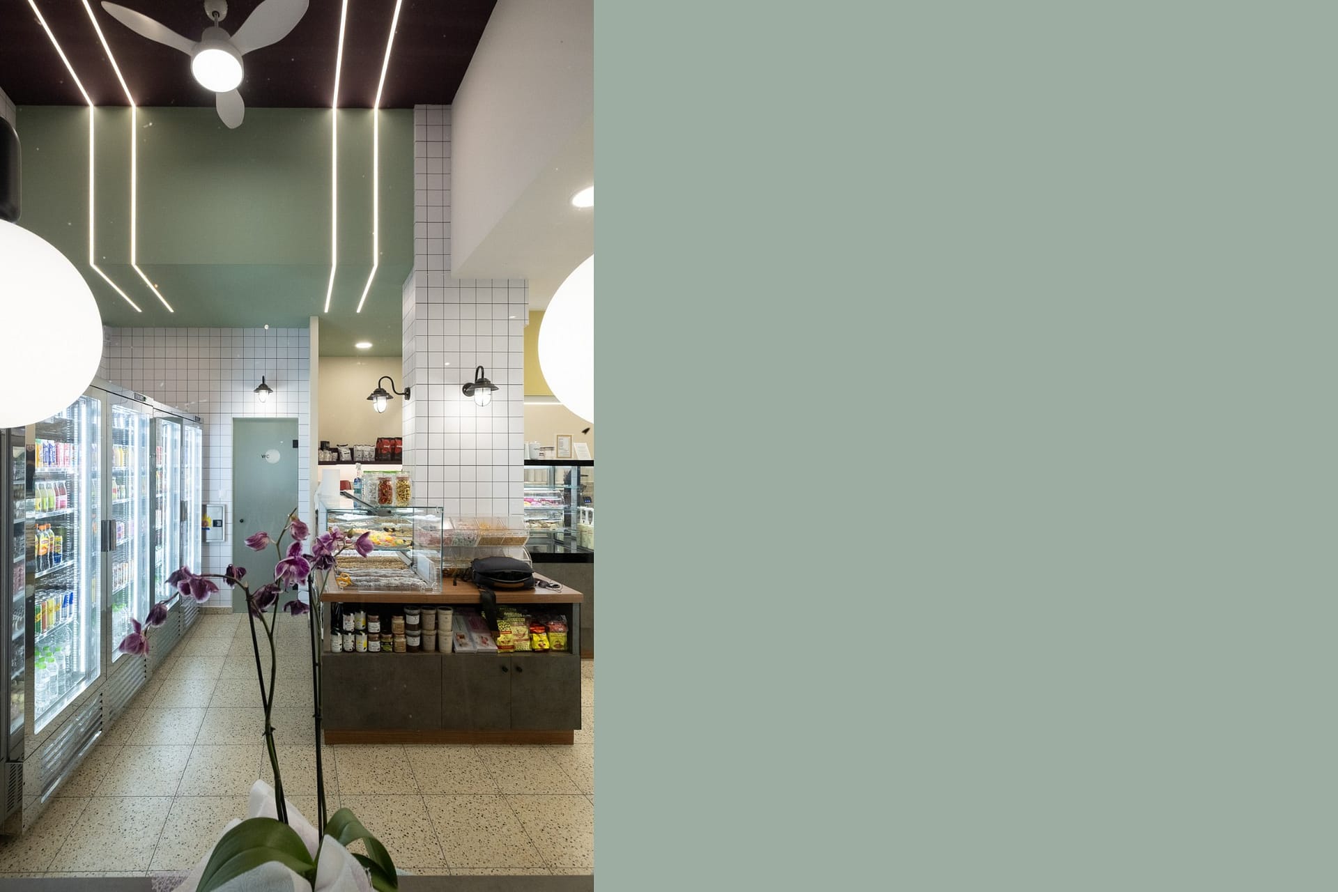 Η επιλογή του δαπέδου terrazzo συνεισφέρει σε μια ρετρό αίσθηση, που παραπέμπει σε κλασικά καφέ παλαιότερων δεκαετιών, ενώ η σύγχρονη εκδοχή του ανανεώνει τον διάλογο με το σήμερα. Η εμφάνιση των ψυγείων και των ραφιών, ενταγμένων στον τοίχο, σχεδιάστηκε έτσι ώστε να διατηρείται οπτική διαφάνεια και λειτουργική καθαρότητα, προβάλλοντας τα προϊόντα σαν εκθέματα.