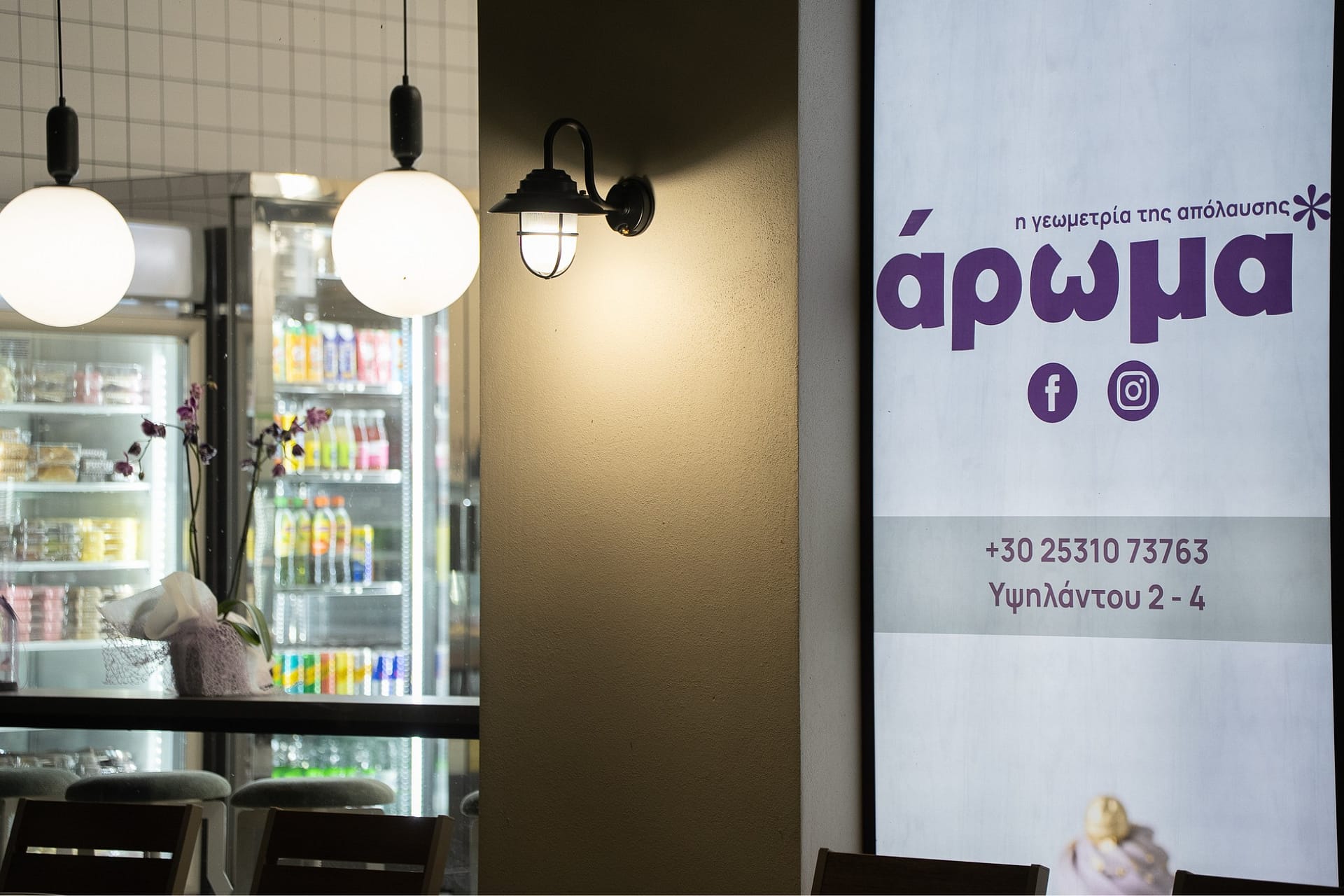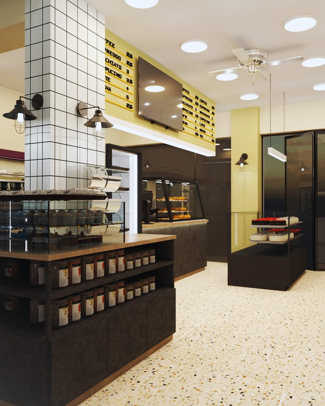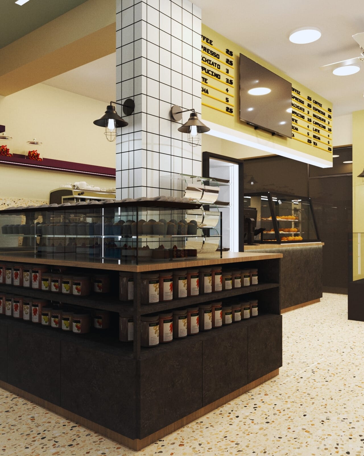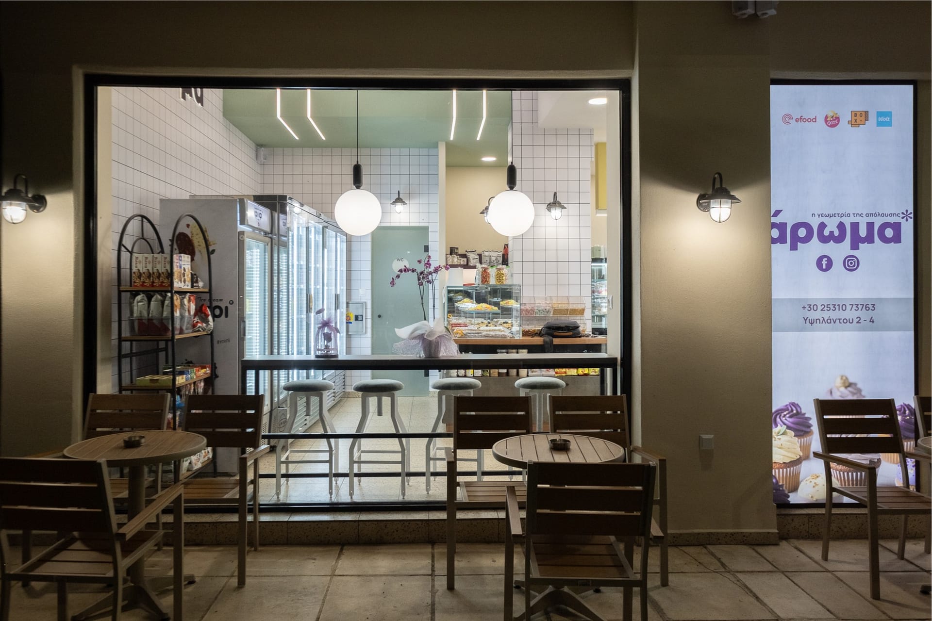 Η επιλογή του δαπέδου terrazzo συνεισφέρει σε μια ρετρό αίσθηση, που παραπέμπει σε κλασικά καφέ παλαιότερων δεκαετιών, ενώ η σύγχρονη εκδοχή του ανανεώνει τον διάλογο με το σήμερα. Η εμφάνιση των ψυγείων και των ραφιών, ενταγμένων στον τοίχο, σχεδιάστηκε έτσι ώστε να διατηρείται οπτική διαφάνεια και λειτουργική καθαρότητα, προβάλλοντας τα προϊόντα σαν εκθέματα.