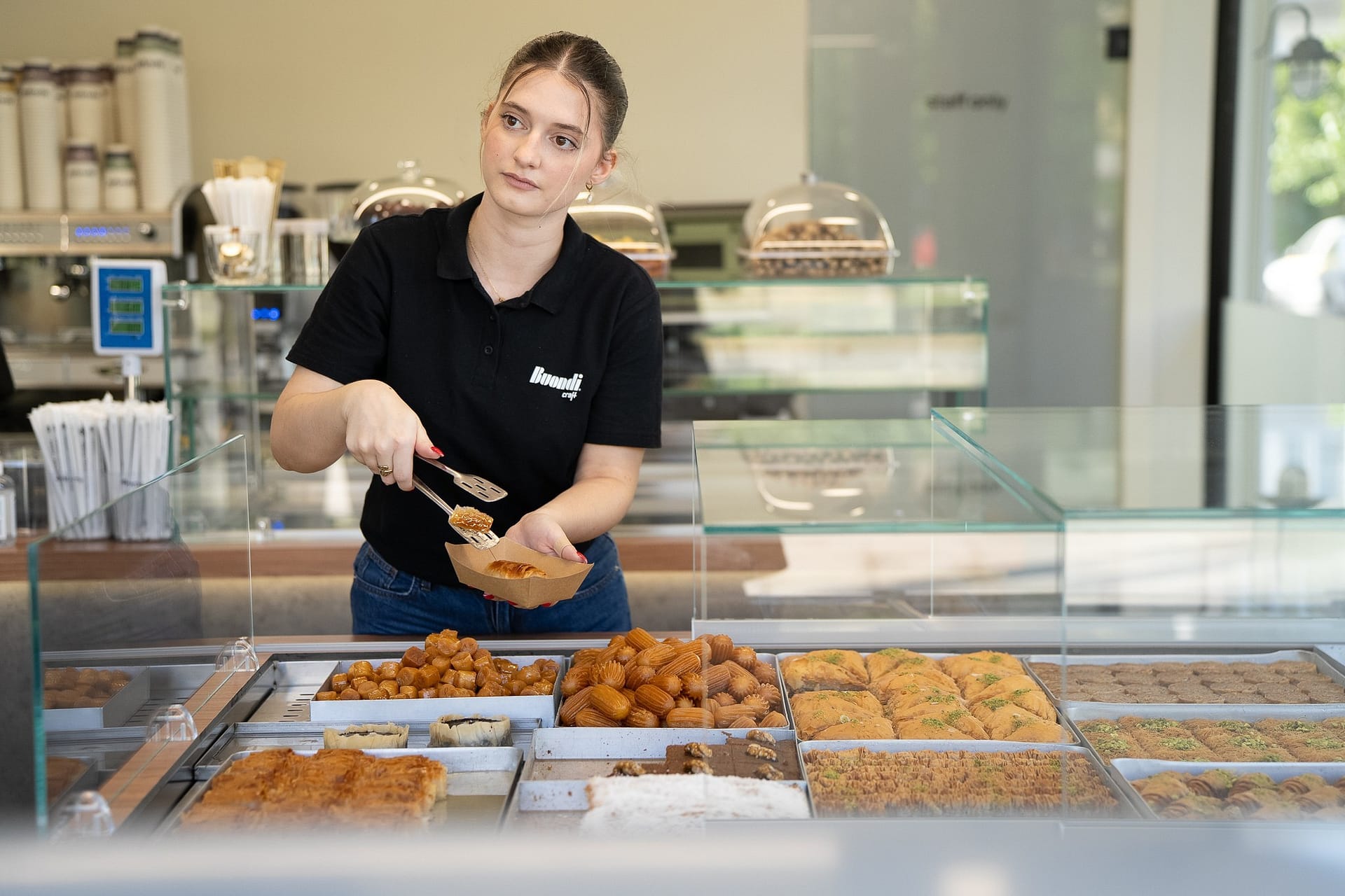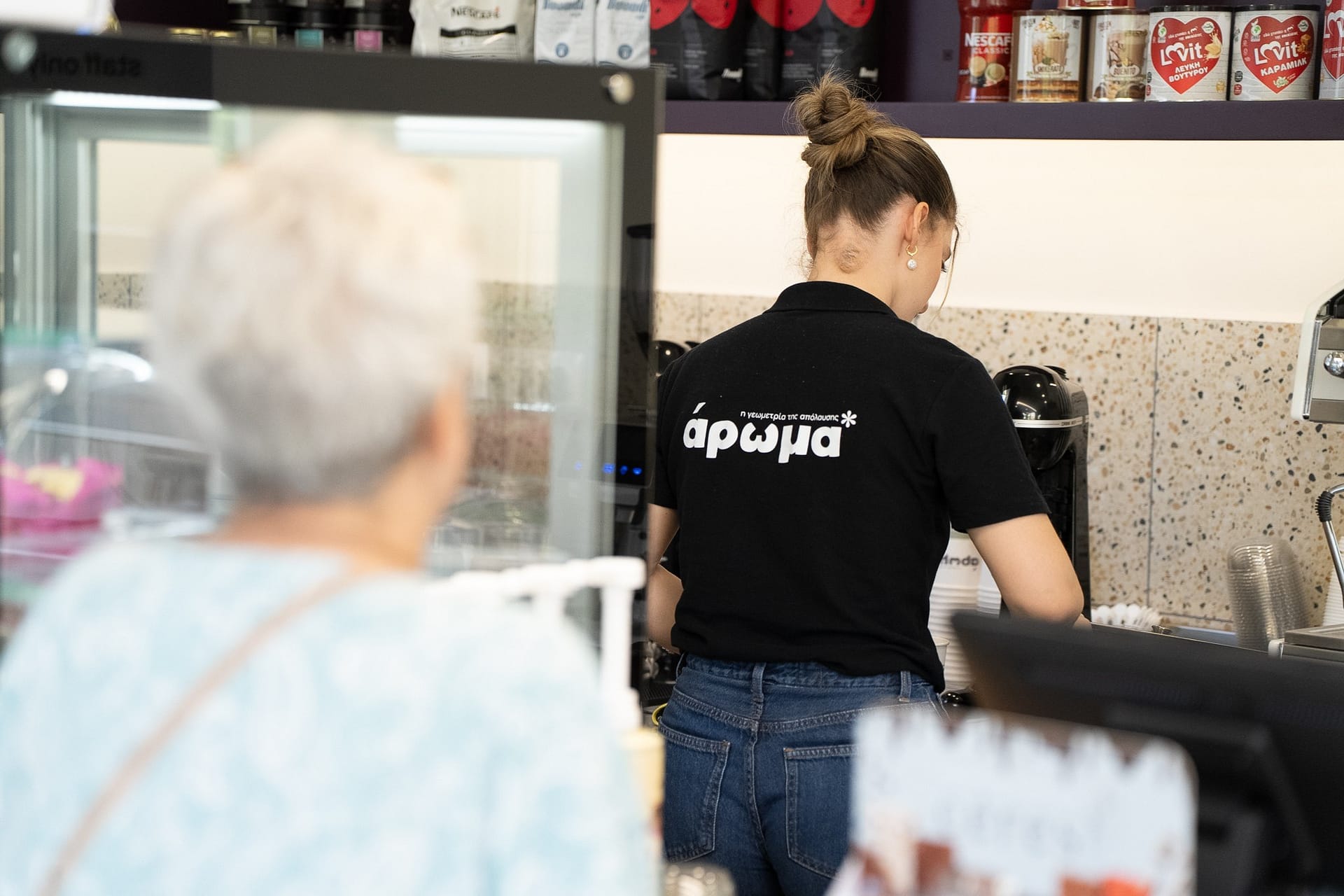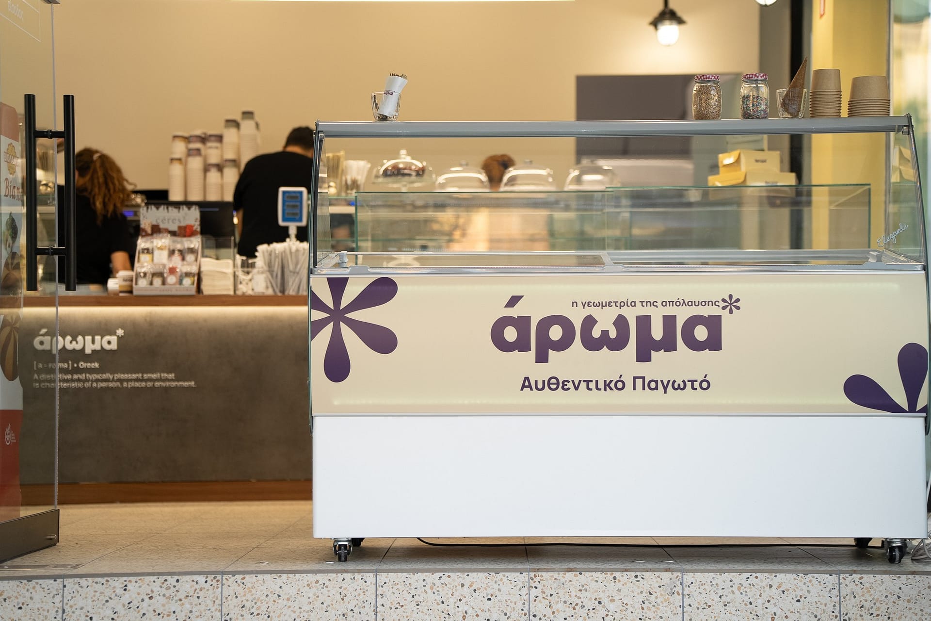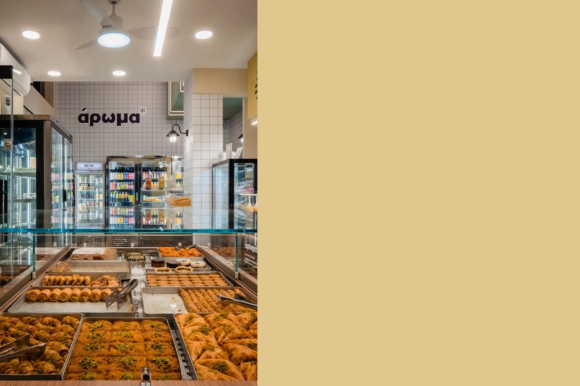 Η επιλογή του δαπέδου terrazzo συνεισφέρει σε μια ρετρό αίσθηση, που παραπέμπει σε κλασικά καφέ παλαιότερων δεκαετιών, ενώ η σύγχρονη εκδοχή του ανανεώνει τον διάλογο με το σήμερα. Η εμφάνιση των ψυγείων και των ραφιών, ενταγμένων στον τοίχο, σχεδιάστηκε έτσι ώστε να διατηρείται οπτική διαφάνεια και λειτουργική καθαρότητα, προβάλλοντας τα προϊόντα σαν εκθέματα.
