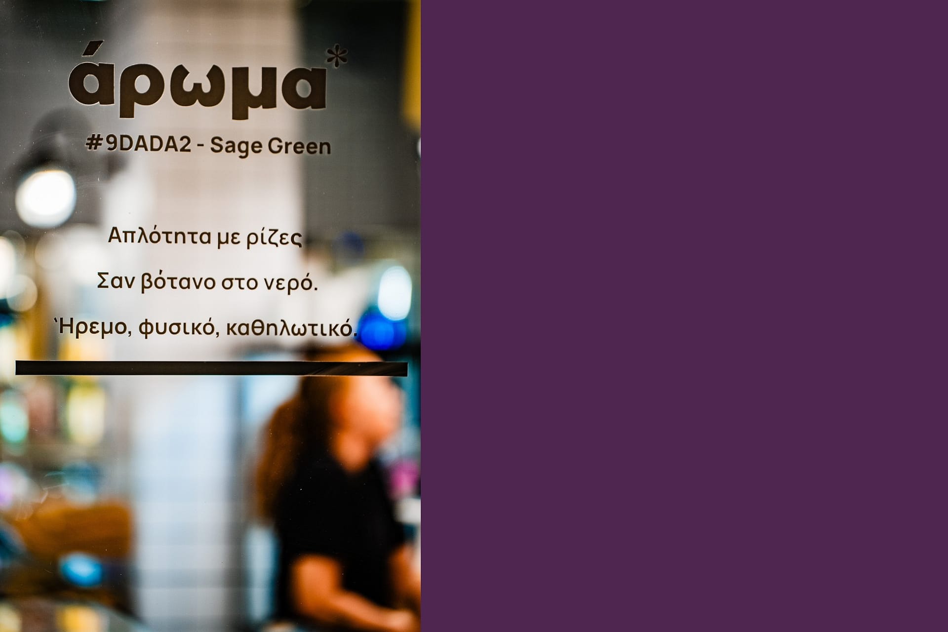 Το λευκό πλέγμα στους τοίχους λειτουργεί ως καμβάς ουδετερότητας, πάνω στον οποίο αναδεικνύονται τα επιλεγμένα χρώματα της ταυτότητας: το βαθύ δαμασκηνί και το πράσινο του φασκόμηλου. Η αντίθεση αυτή αποπνέει κομψότητα και ταυτόχρονα προκαλεί μια οικεία νοσταλγία. Η χρήση αυστηρών γεωμετριών, τόσο στην οροφή όσο και στους όγκους των επίπλων, δημιουργεί μια καθαρή, σχεδόν «γραφική» εικόνα που αναδεικνύεται από τον έμμεσο φωτισμό.