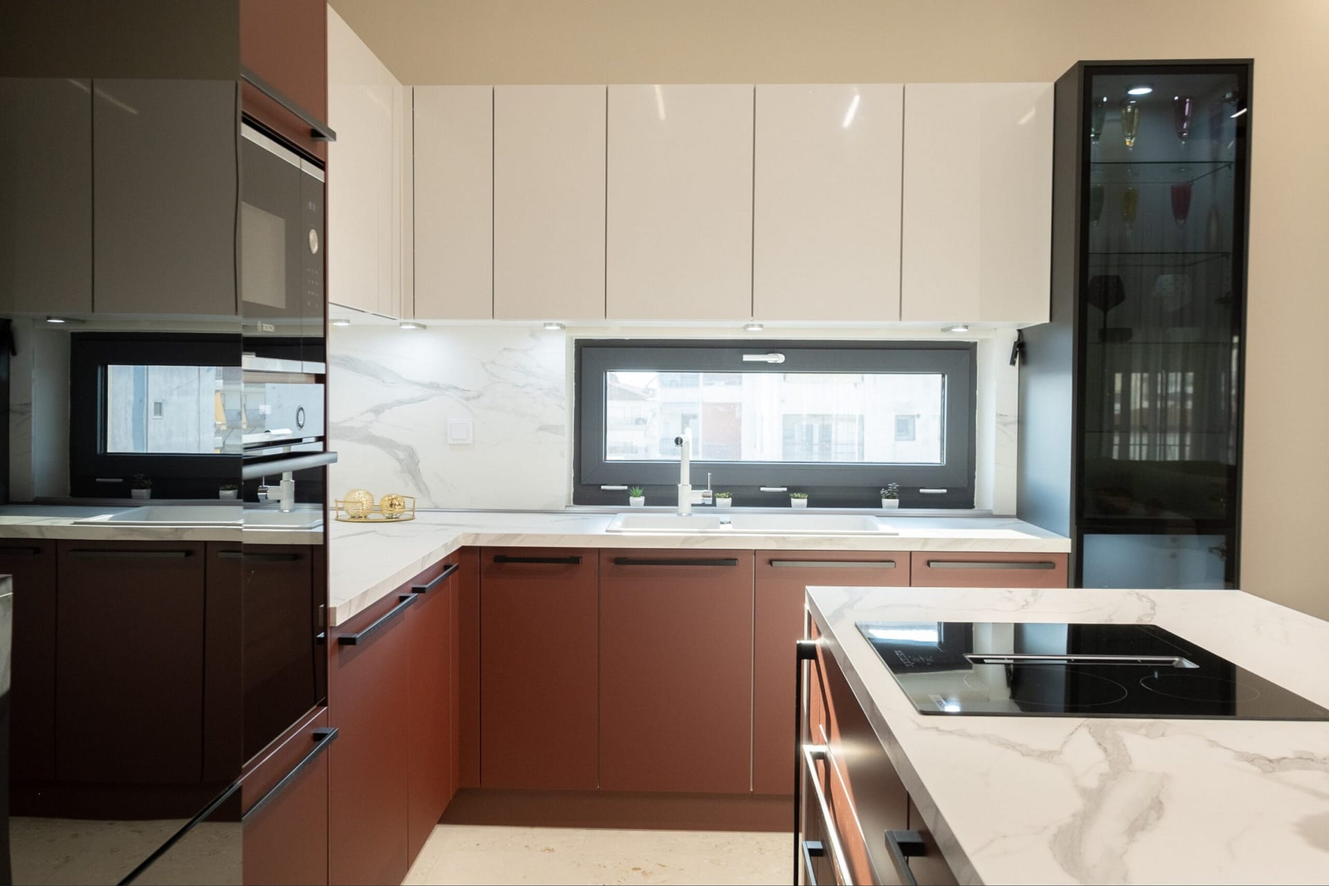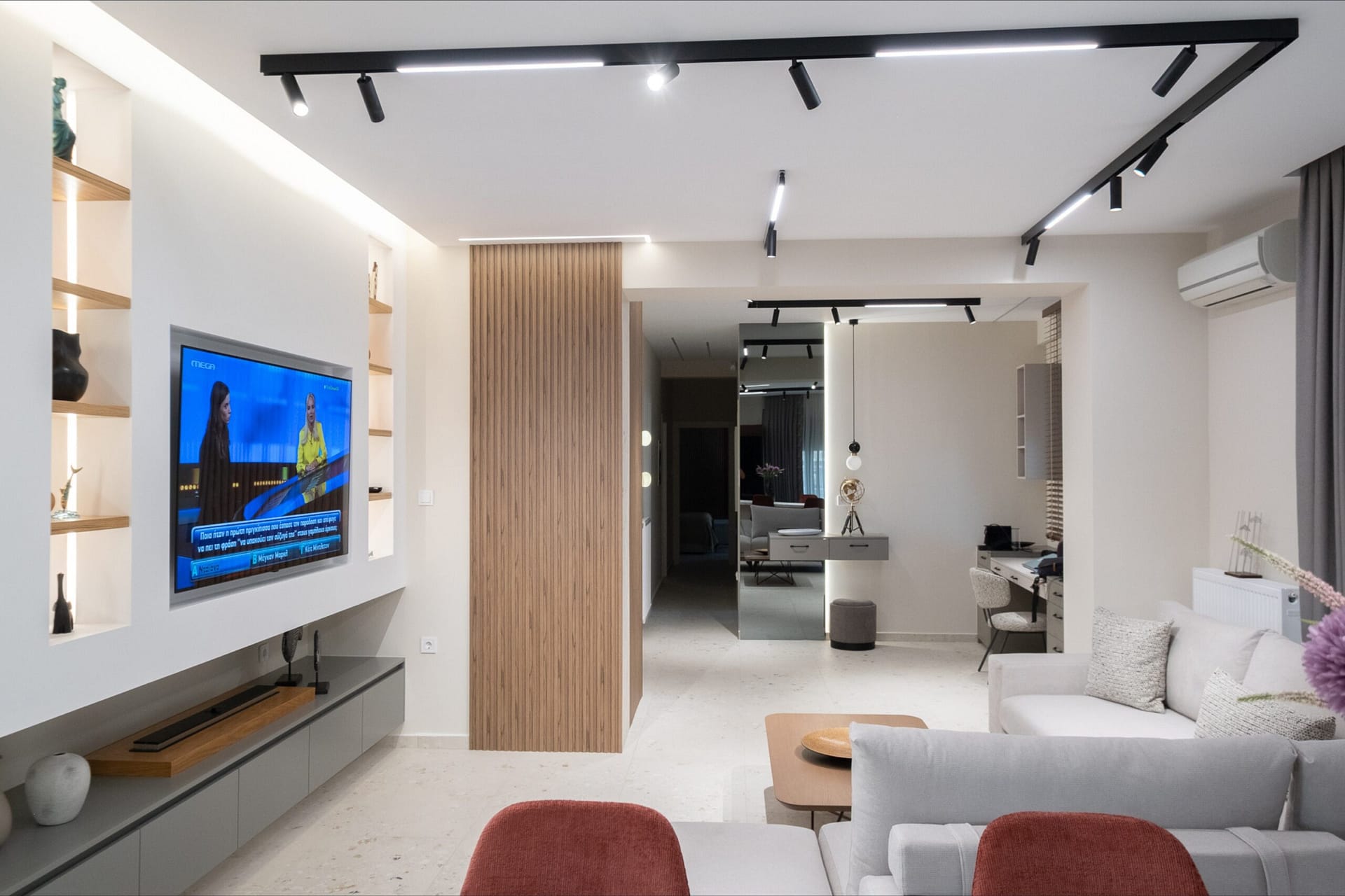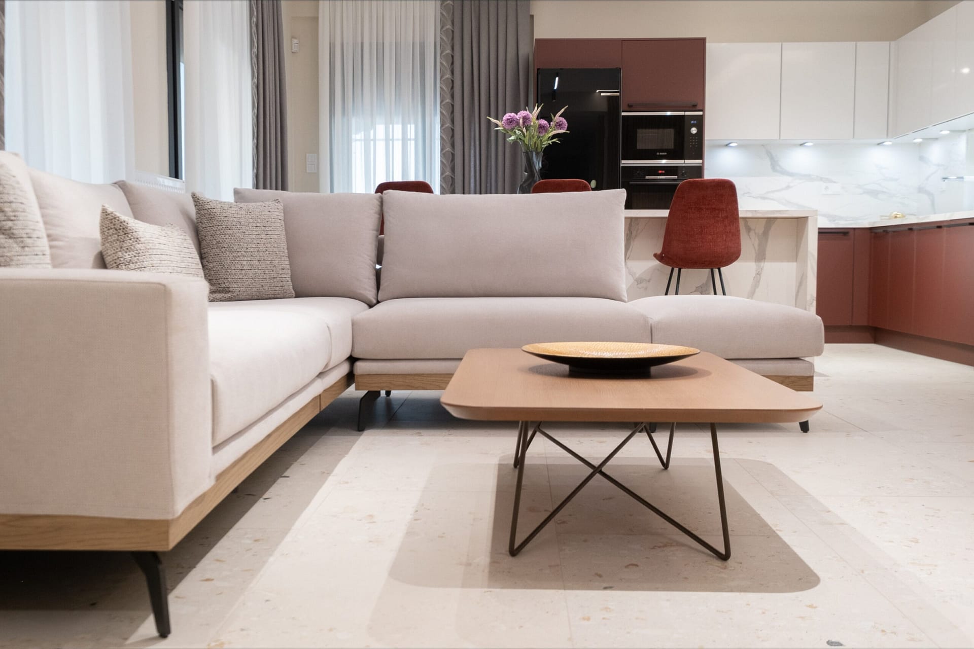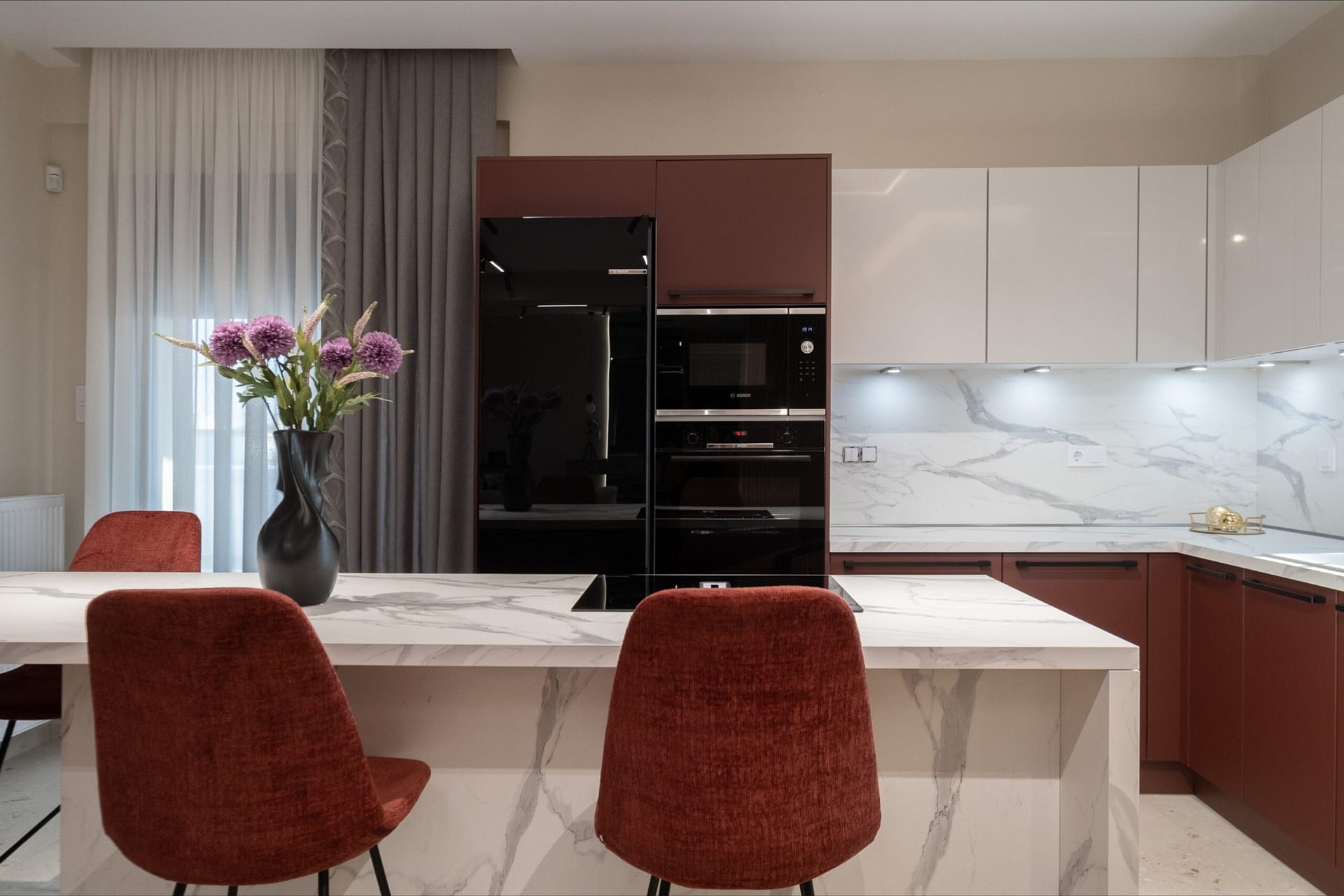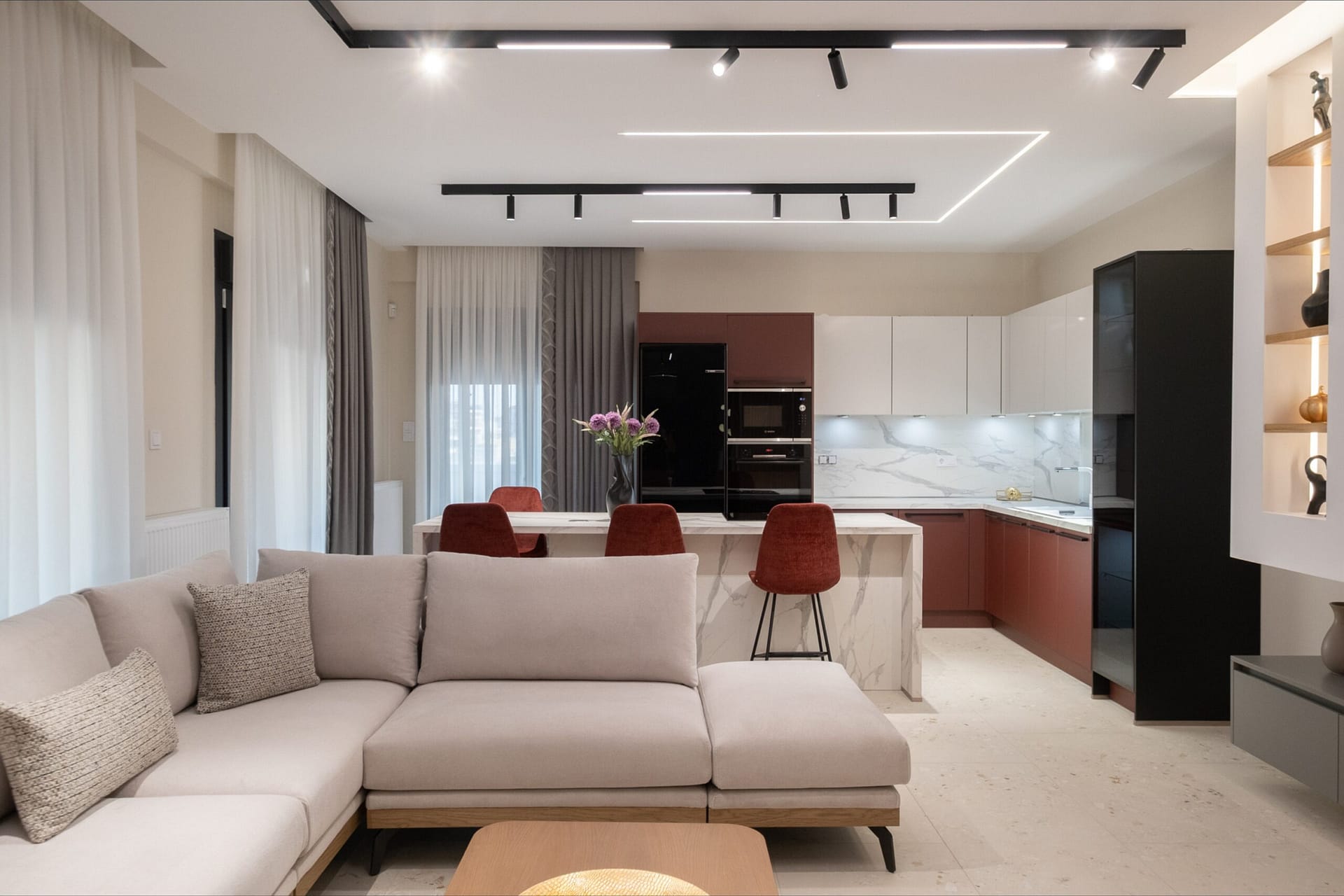 Ο ενιαίος χώρος καθιστικού και κουζίνας διαμορφώθηκε με ματ υφές, μαρμάρινες επιφάνειες και ζεστούς τόνους του μπορντό για να αποδοθεί χαρακτήρας χωρίς υπερβολή. Οι γραμμικοί φωτισμοί στην οροφή λειτουργούν ως διακριτικό στοιχείο οργάνωσης του χώρου, ενώ τα έπιπλα δένουν λειτουργικά και αισθητικά, δημιουργώντας ένα ευχάριστο και οικείο περιβάλλον.