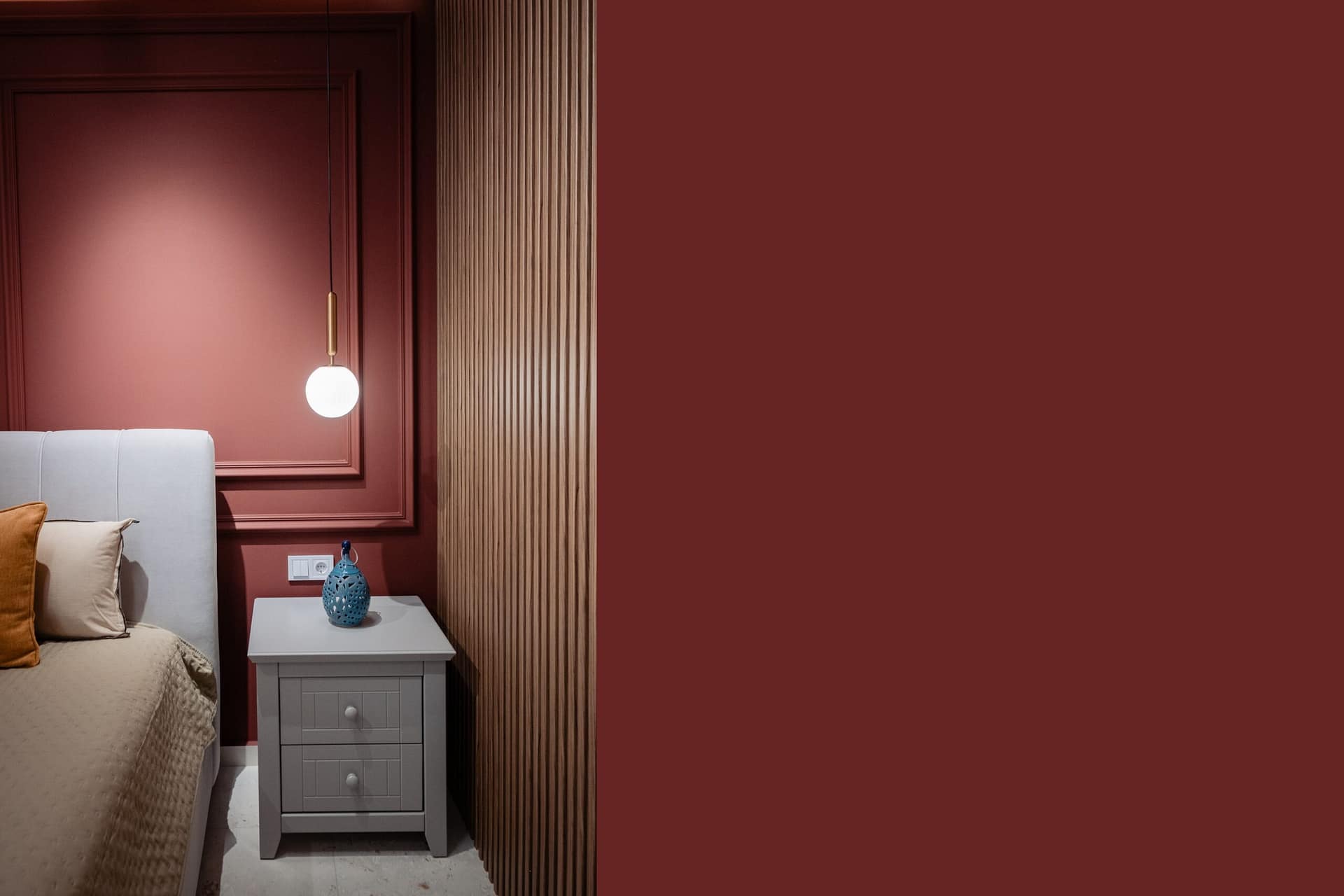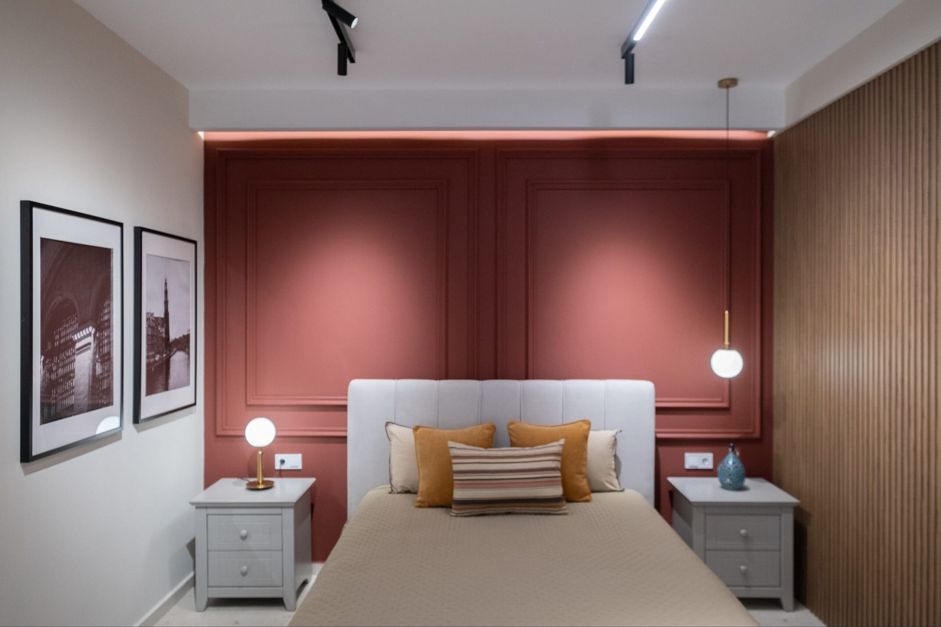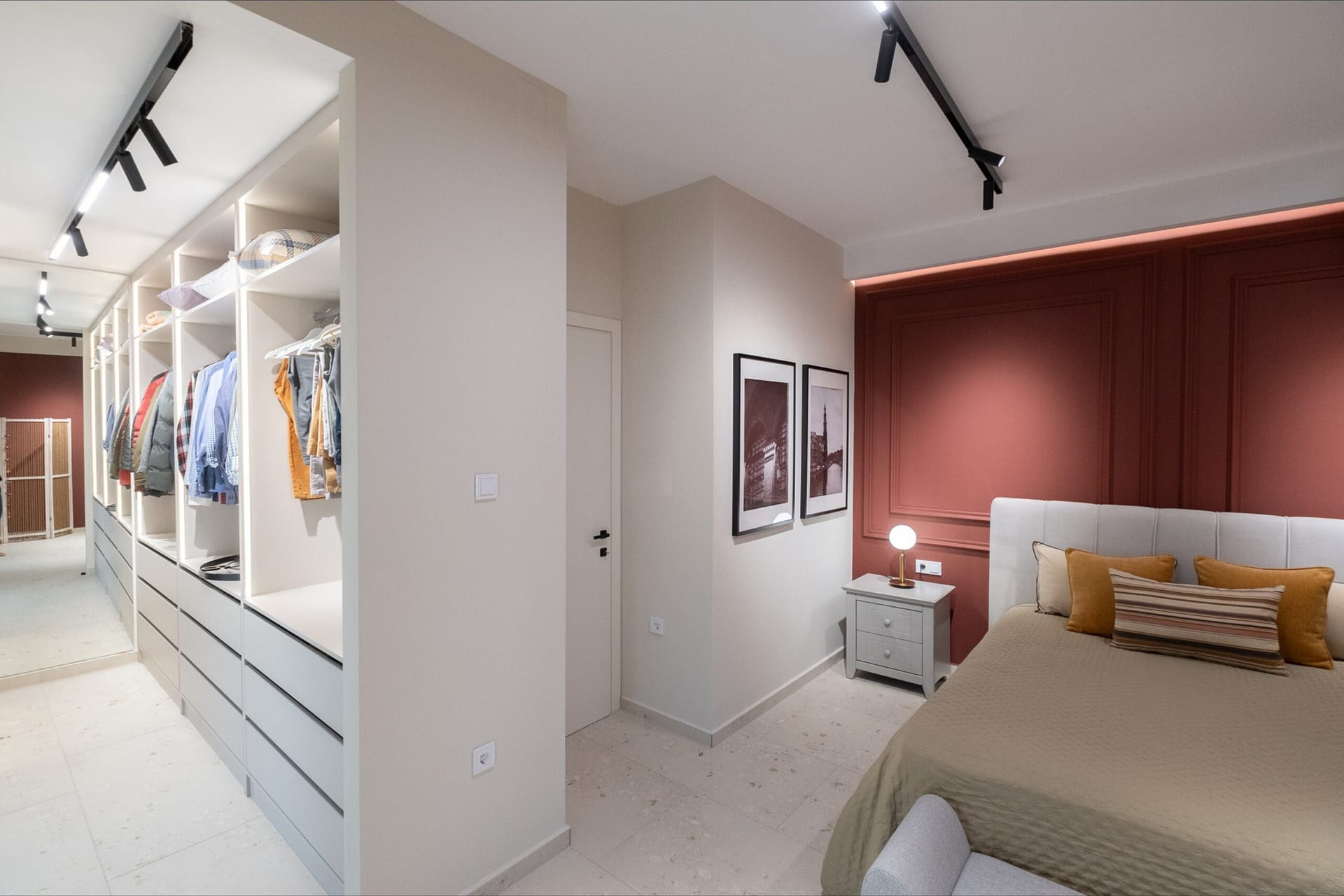 Στο υπνοδωμάτιο, η σύνθεση επικεντρώνεται στη χρωματική αντίθεση του βαθύ κόκκινου τοίχου με τα απαλά υφάσματα του κρεβατιού και την διακριτική ένταση του έμμεσου φωτισμού. Ξεχωριστό στοιχείο αποτελεί η ενσωματωμένη ανοιχτή ντουλάπα, η οποία προσφέρει πρακτικότητα χωρίς να διαταράσσει την ηρεμία του υπνοδωματίου, χάρη στην απόλυτα συμμετρική και φωτισμένη γεωμετρία της.