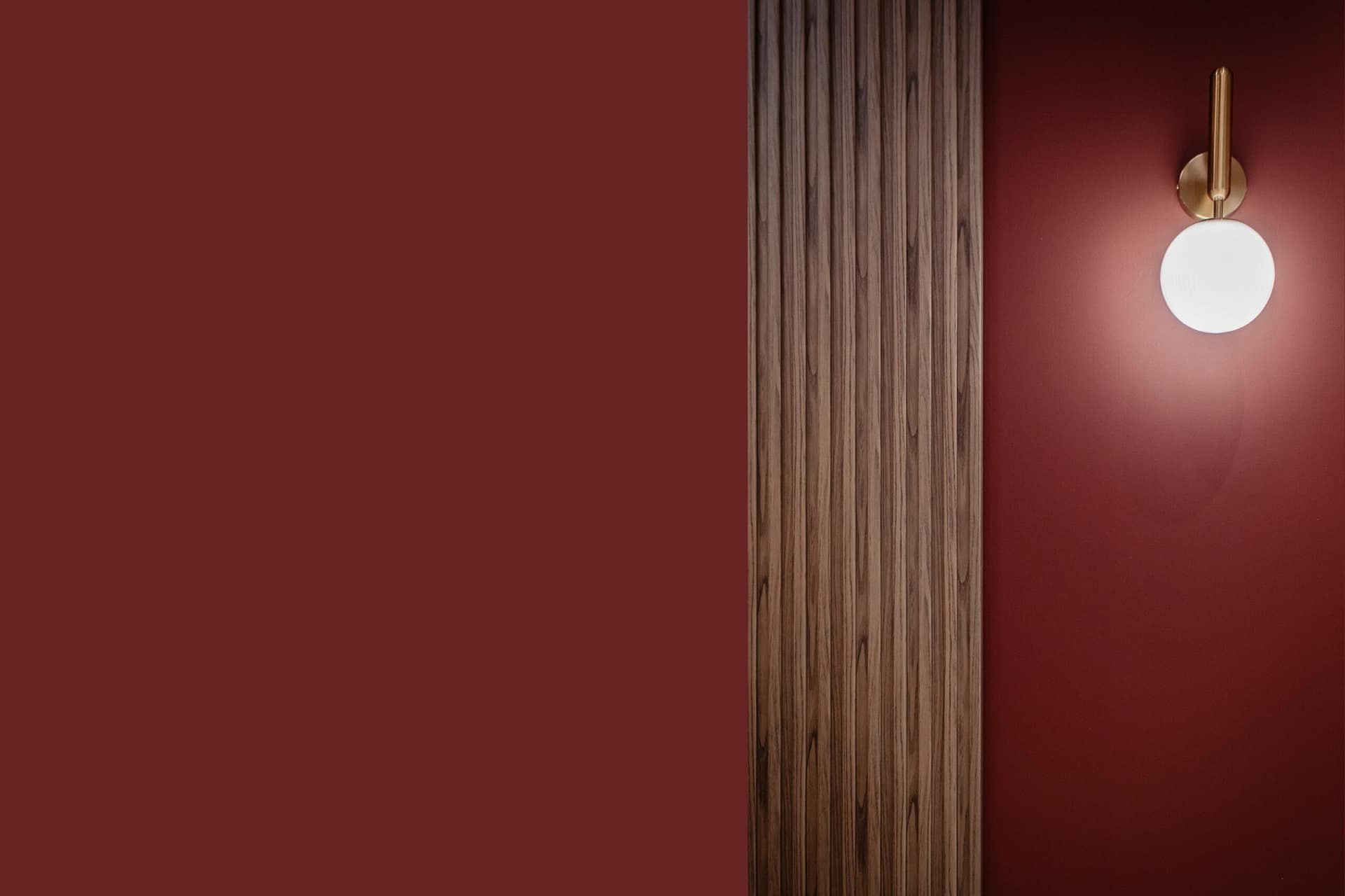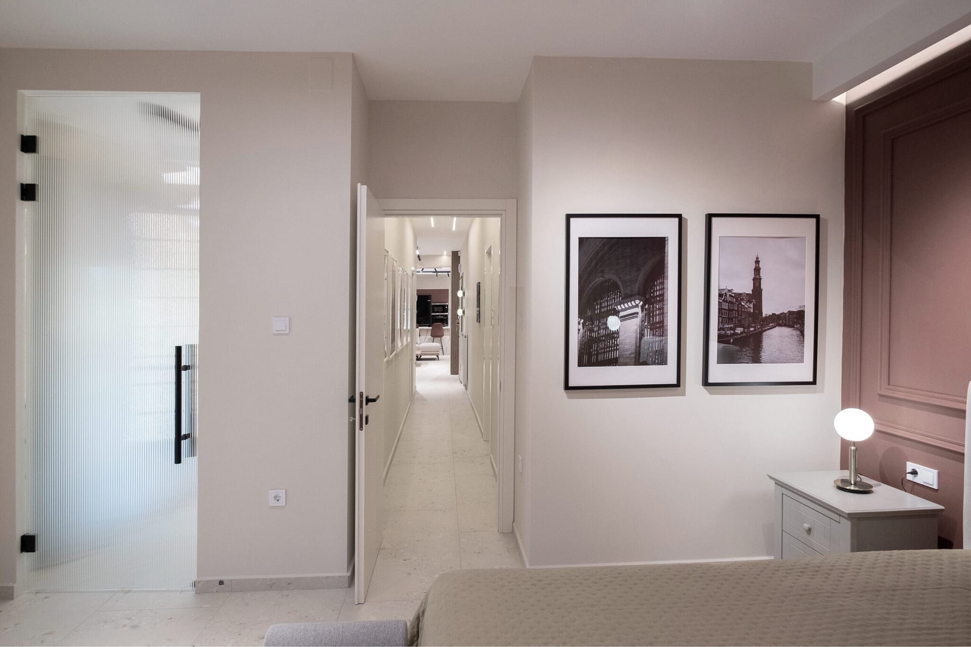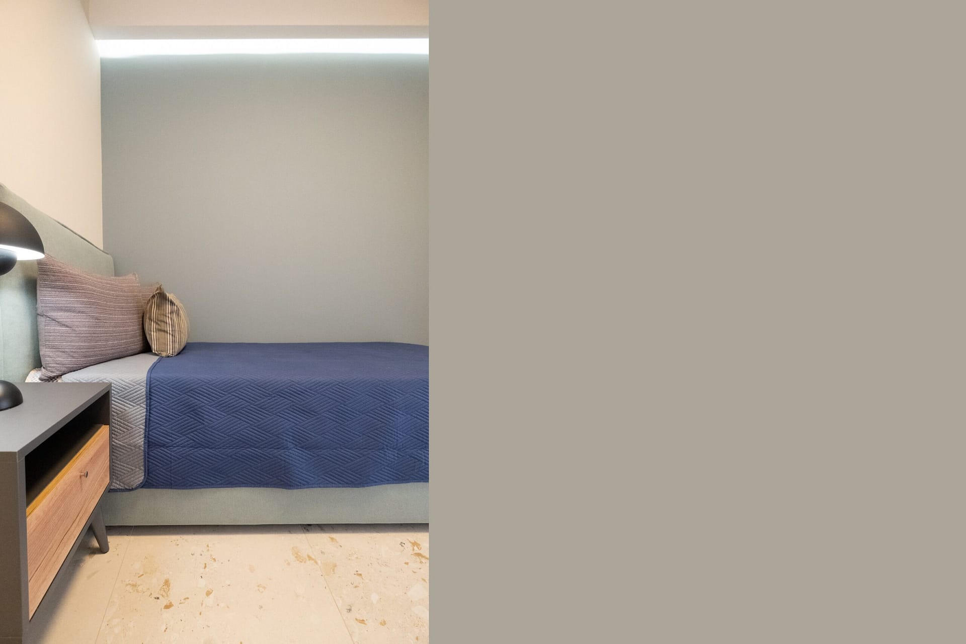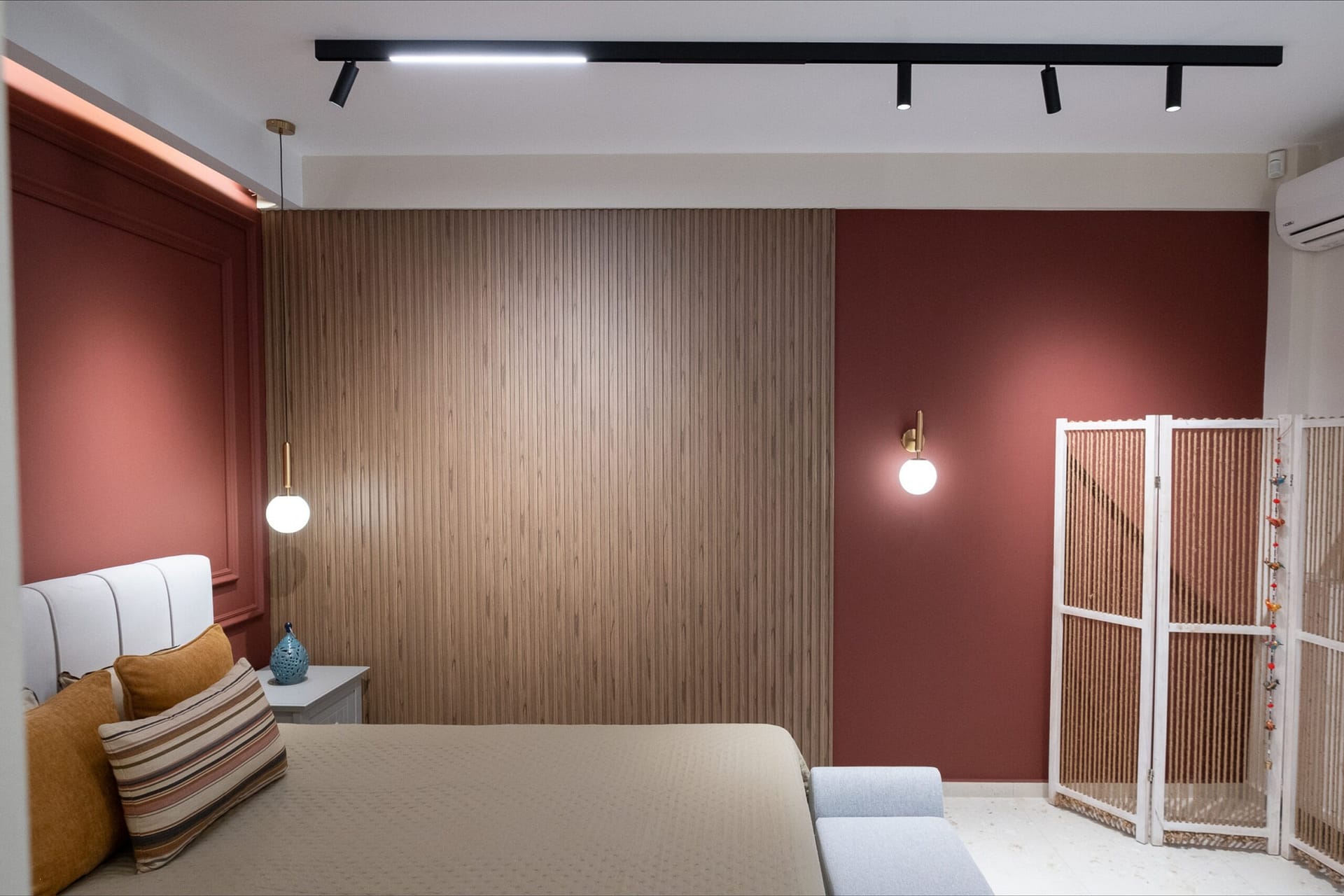 Στο υπνοδωμάτιο, η σύνθεση επικεντρώνεται στη χρωματική αντίθεση του βαθύ κόκκινου τοίχου με τα απαλά υφάσματα του κρεβατιού και την διακριτική ένταση του έμμεσου φωτισμού. Ξεχωριστό στοιχείο αποτελεί η ενσωματωμένη ανοιχτή ντουλάπα, η οποία προσφέρει πρακτικότητα χωρίς να διαταράσσει την ηρεμία του υπνοδωματίου, χάρη στην απόλυτα συμμετρική και φωτισμένη γεωμετρία της.