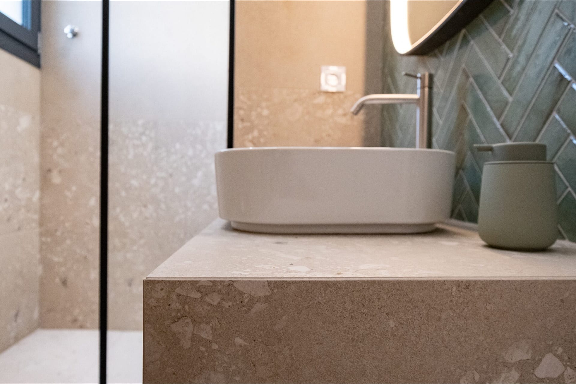 Το δάπεδο σε όλη την κατοικία ολοκληρώνει την αίσθηση ελαφρότητας, μέσα από μια ουδέτερη επένδυση σε απαλή υφή μωσαϊκού, προσφέροντας συνοχή, διαχρονικότητα και φυσική φωτεινότητα.